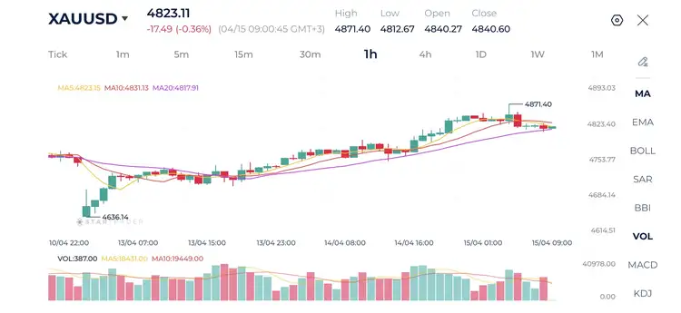 Vàng vẫn duy trì cấu trúc tăng rõ ràng trên khung 1 giờ sau đợt tăng mạnh kể từ đầu tháng 4.Giá đang giữ trên đường trung bình động MA20, trong khi MA5 và MA10 nằm gần mức giá hiện tại, cho thấy động lượng đang chậm lại nhưng xu hướng tăng ngắn hạn vẫn được duy trì.Các cây nến gần đây cho thấy trạng thái đi ngang tích lũy, thường xuất hiện sau một nhịp tăng mạnh.